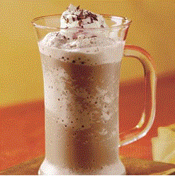 Process coffee ice cubes, 1 1/4 cups milk, and chocolate syrup in a blender until smooth. Dollop evenly with whipped topping, and sprinkle with chocolate shavings. Serve immediately.
