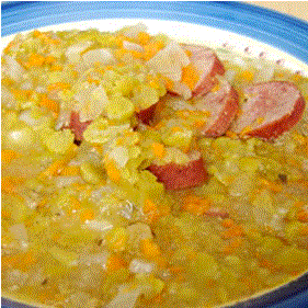 1. In a 5 quart slow cooker, combine the peas, water, sausage, bouillon, carrot, celery, potatoes, garlic powder, oregano, bay leaves, and onion.
