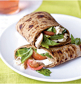 2. Heat a large nonstick skillet over medium-high heat. Coat pan with cooking spray. Working with 1 flatbread at a time, cook bread 1 minute on each side or until toasted. Rub 1 side of each flatbread with cut sides of garlic. Arrange 1 1/2 cups chicken mixture in the center of each flatbread; roll up.